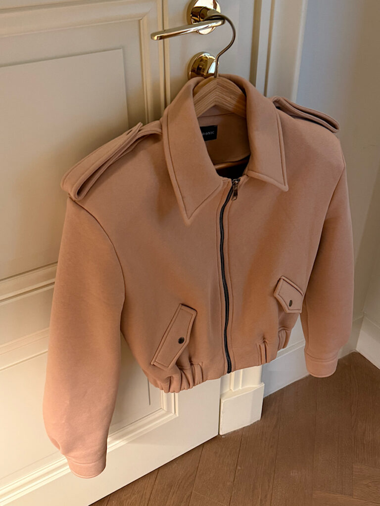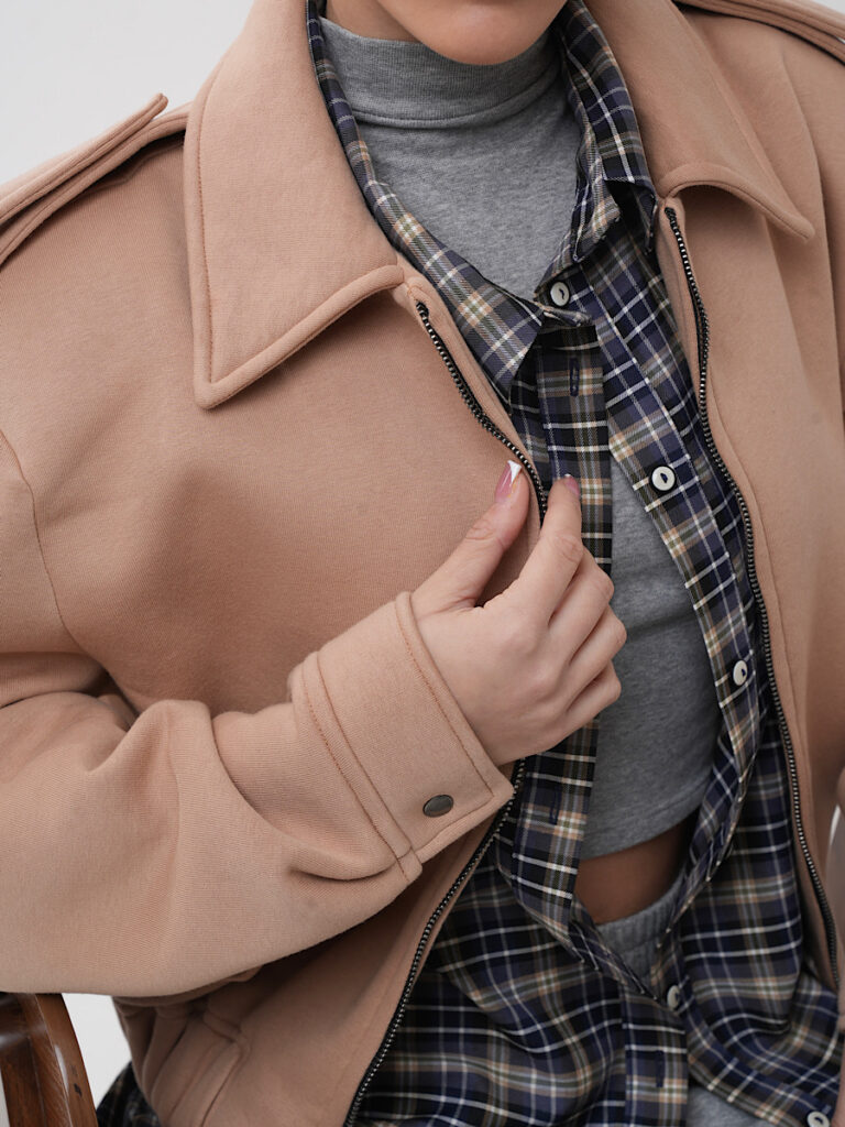 Model zapinany na metalowy czarny zamek, wyróżnia się dopracowanymi detalami – dwoma pagonami na ramionach, które nadają jej nowoczesnego charakteru, oraz dwiema kieszeniami zapinanymi na czarne napy.